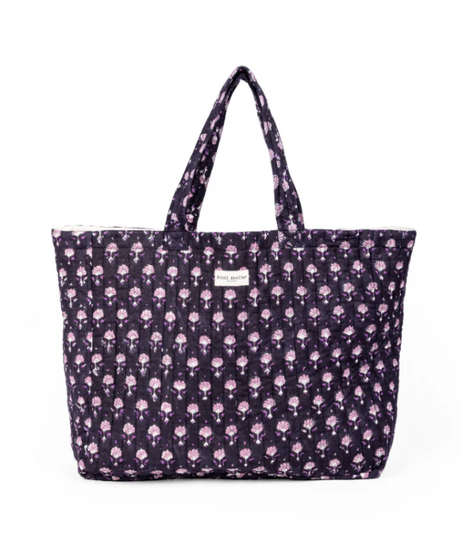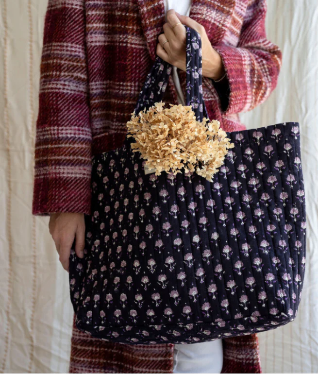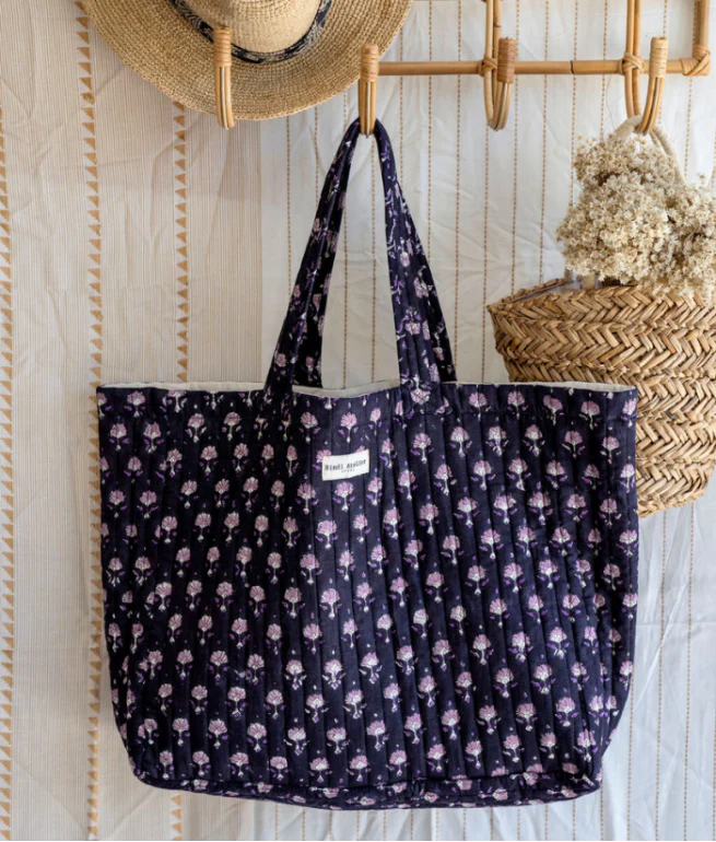 Ce sac cabas matelassé, réalisé avec soin en Inde, est imprimé au bloc de bois, offrant un charme artisanal unique.