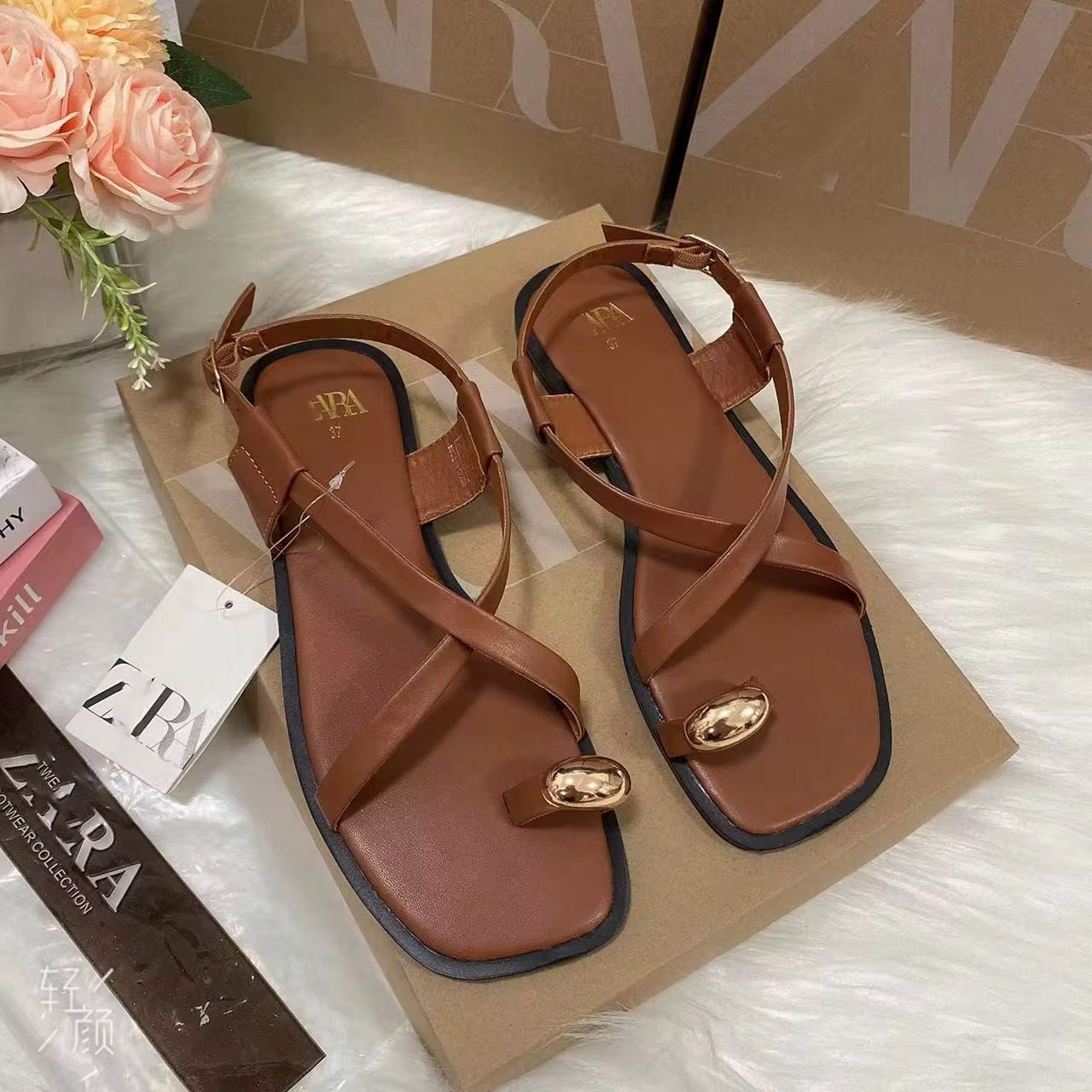 Nom du produit : Sandales plates à boucle dorée – Collection ZARA Été Couleur : Marron caramel beige noir blanc Design : Style minimaliste et chic Lanières croisées en cuir synthétique marron Détail doré sur la boucle de maintien du gros orteil Bout carré moderne Fermeture à boucle réglable autour de la cheville Marque : ZARA (étiquette visible) Utilisation : Idéales pour les looks décontractés ou élégants d’été, à porter avec robes, jeans ou tenues bohèmes.
