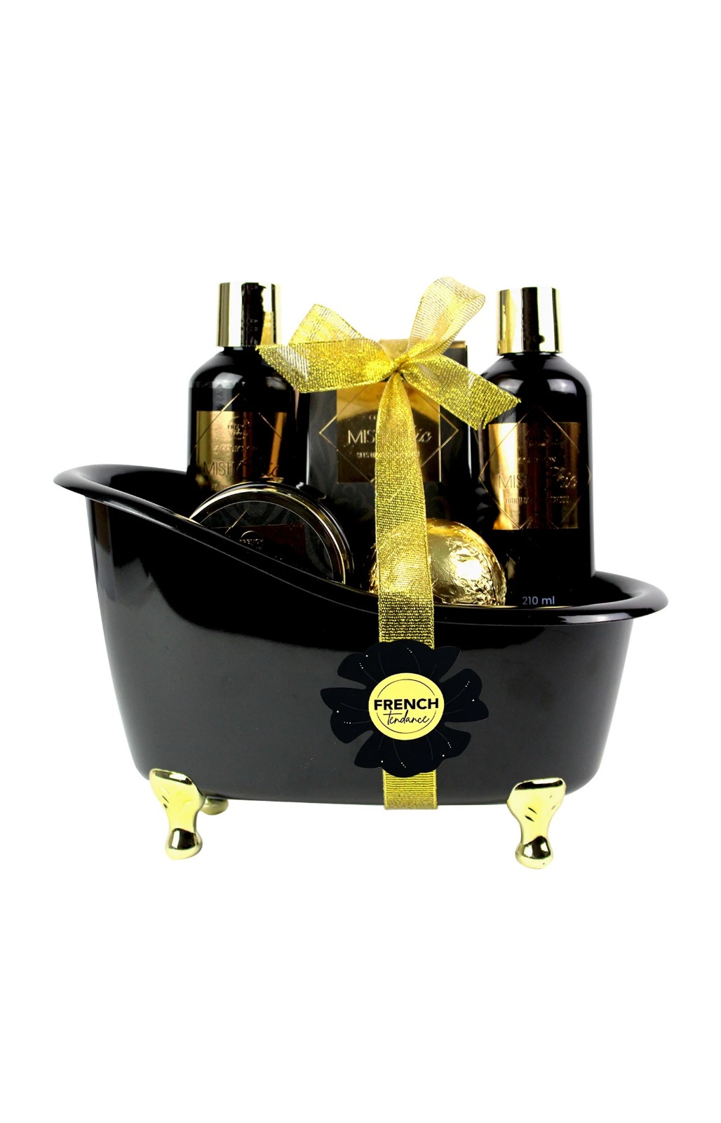 Le Coffret soin baignoire – Corps – Patchouli de French Tendance est un ensemble de soins pour le bain et le corps parfumé à la fragrance de patchouli, présenté dans une mini baignoire déco (noire et dorée). Il est pensé pour offrir une vraie expérience détente et bien-être à la maison, tout en parfumant délicatement la peau.