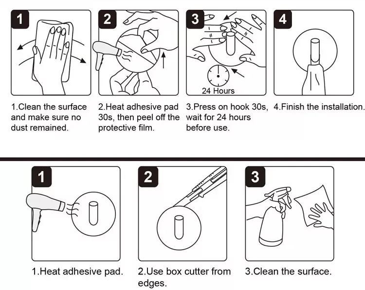 Notre crochet auto-adhésif est également facile à utiliser. Il suffit de retirer le film protecteur de l’adhésif et de le coller sur une surface propre et sèche. Le crochet adhère fermement à la surface, vous permettant de suspendre vos objets en toute sécurité. Il peut être facilement retiré sans laisser de traces, vous offrant une grande flexibilité d’utilisation.