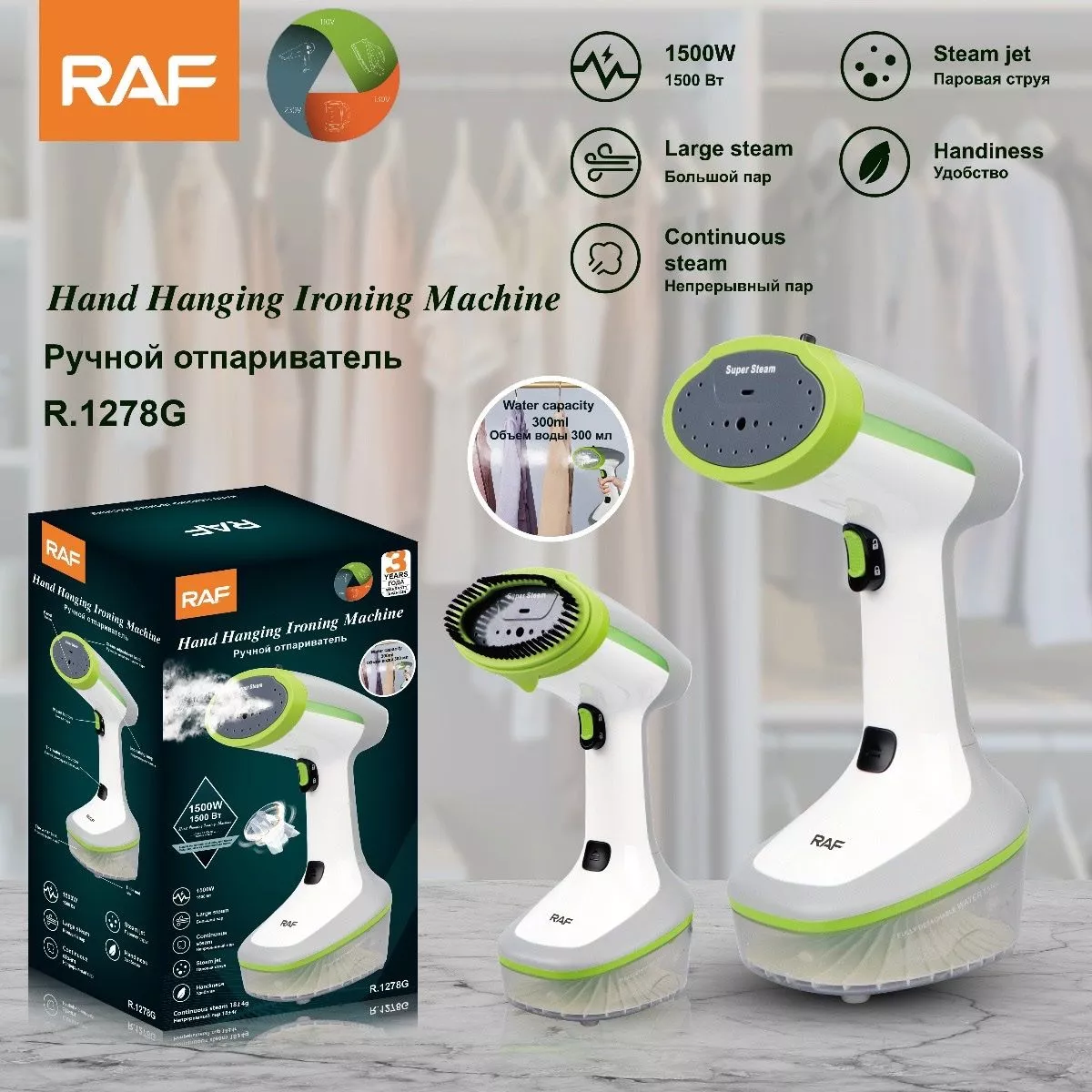 Puissance nominale: 1500W Longueur cordon: 1,5M Capacité réservoir: 300ML
