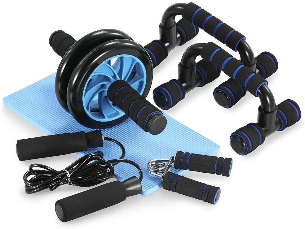 Appareils de Fitness 5 en 1 Roue Abdominale + Poignée de Pompe + Corde à Sauter + Pince à Main + Tapis pour Genou Kit Complet pour Fitness Exercices Musculation.