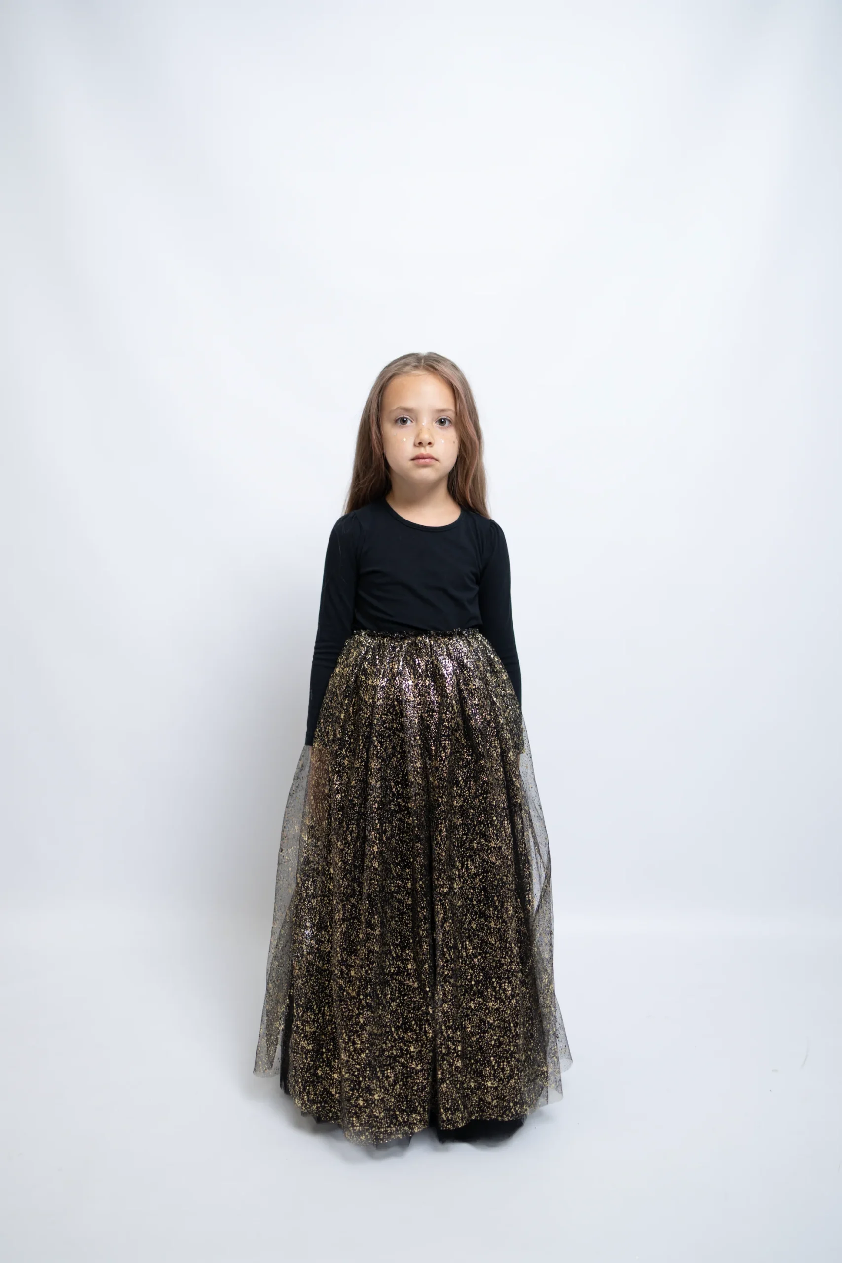 Un showstopper envoûtant ! La longue jupe tutu Willa projette une lueur magique avec ses couches de tulle noir scintillant, qui coule jusqu’au sol. Fini avec une ceinture en satin élégante pour plus de confort et d’élégance.