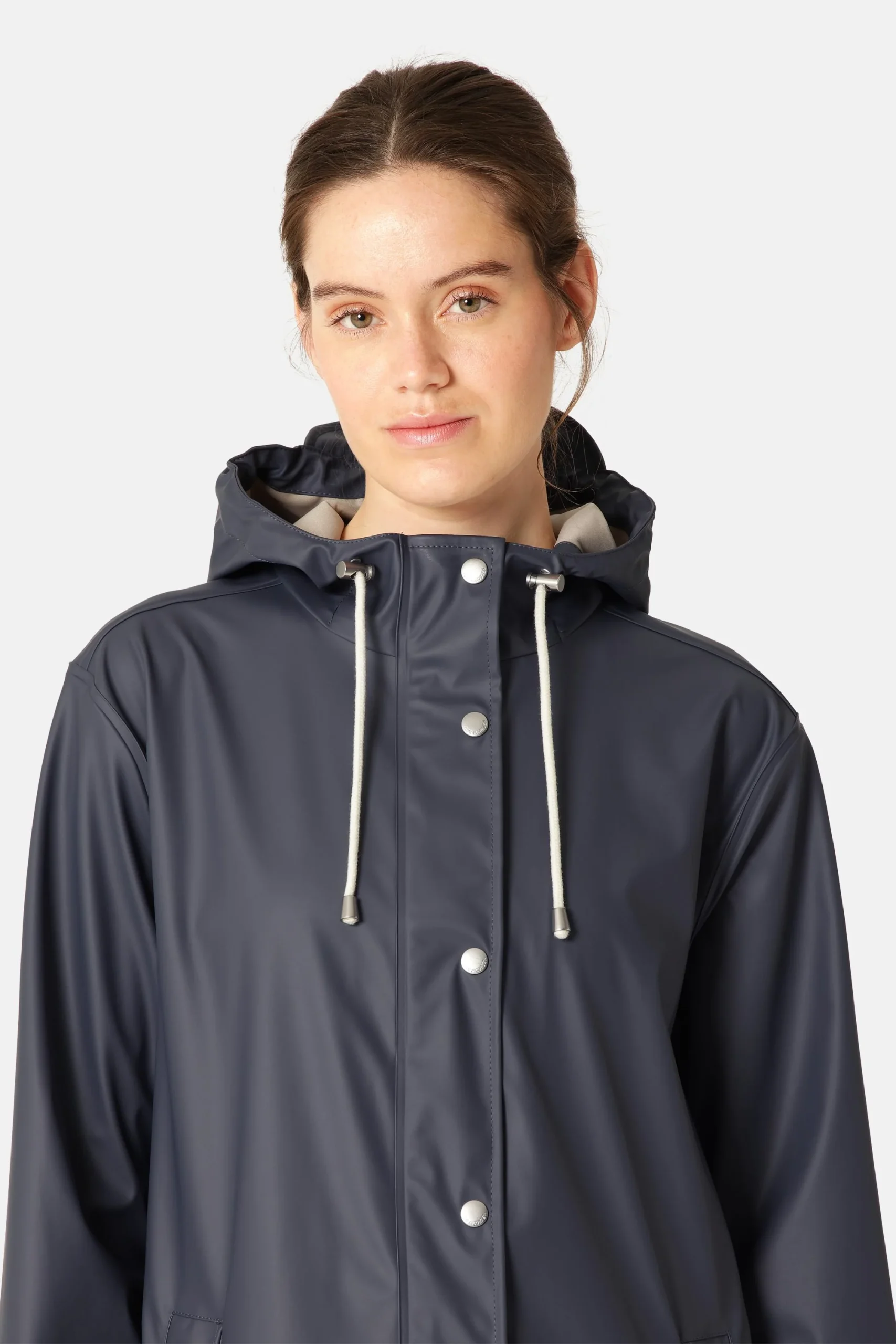 This long A-line raincoat is crafted from durable rubberized PU-coated fabric with a soft tricot backing for comfort. Designed for full rain protection, it features welded seams and a 5,000 mm waterproof rating. The adjustable drawstring hood with a small cap provides extra coverage against heavy rain, while underarm eyelets enhance breathability. Slanted front pockets add practicality, making this a versatile essential for wet weather.