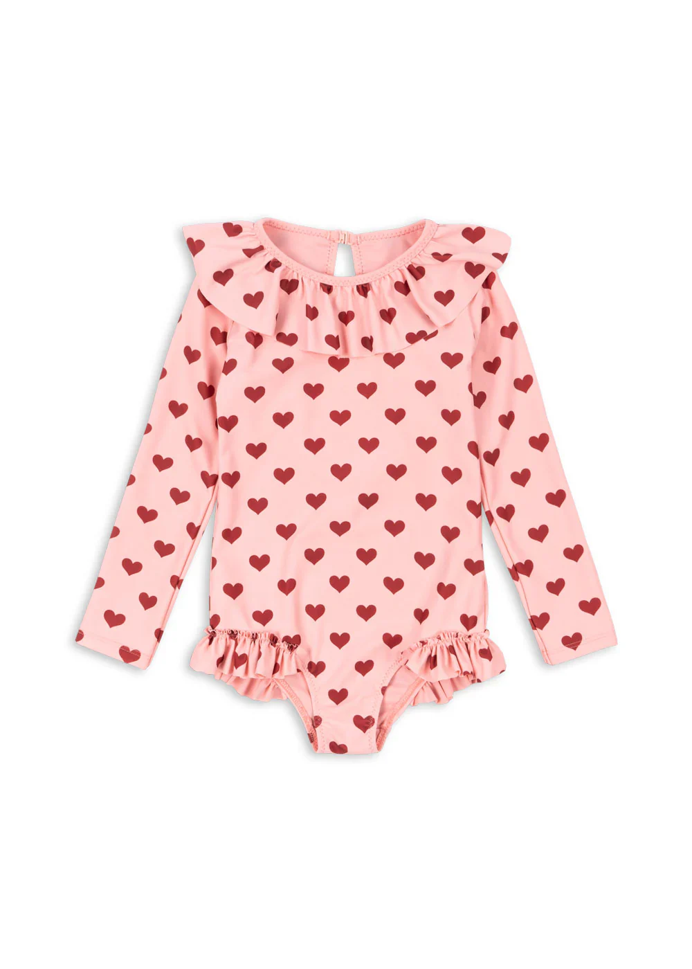 Maillot de bain à manches longues conçu avec des volants aux épaules. Le maillot protège contre le soleil avec le facteur de protection UV le plus élevé, SPF 50+.