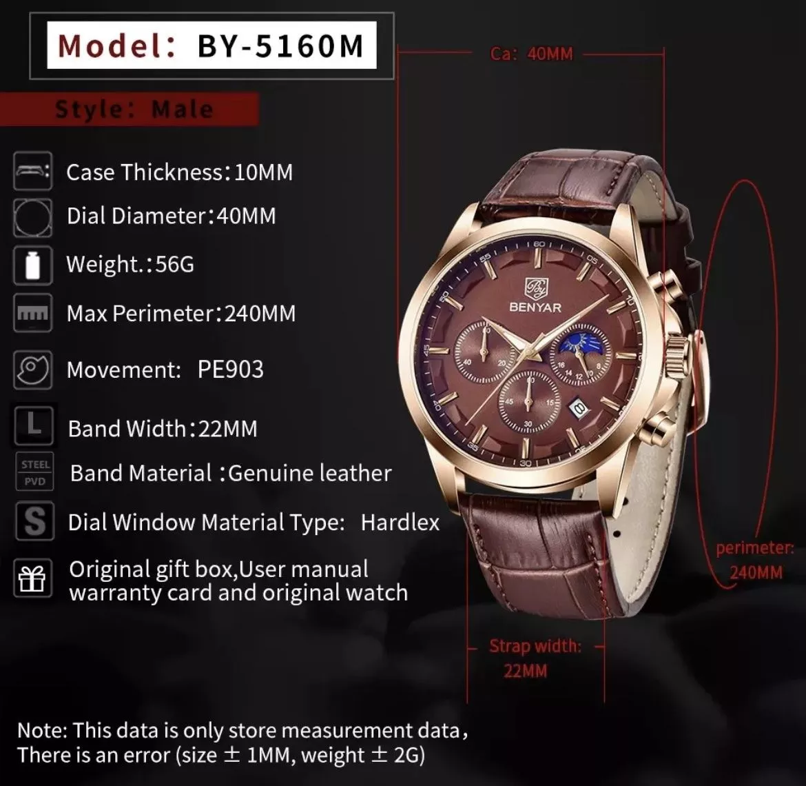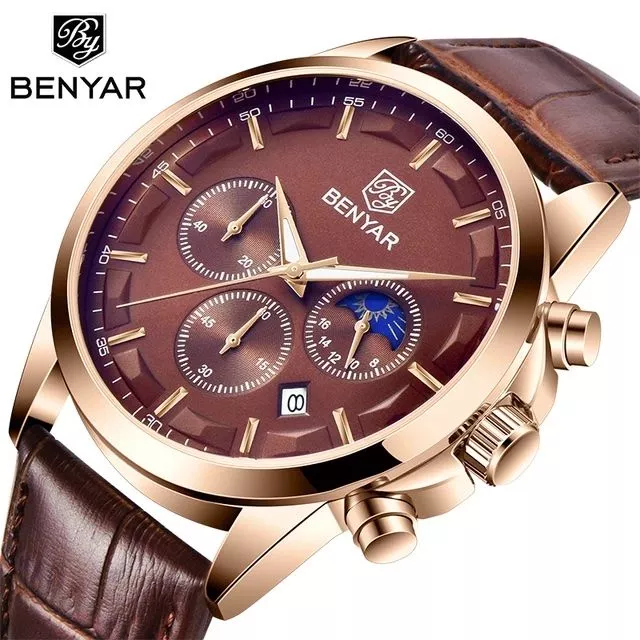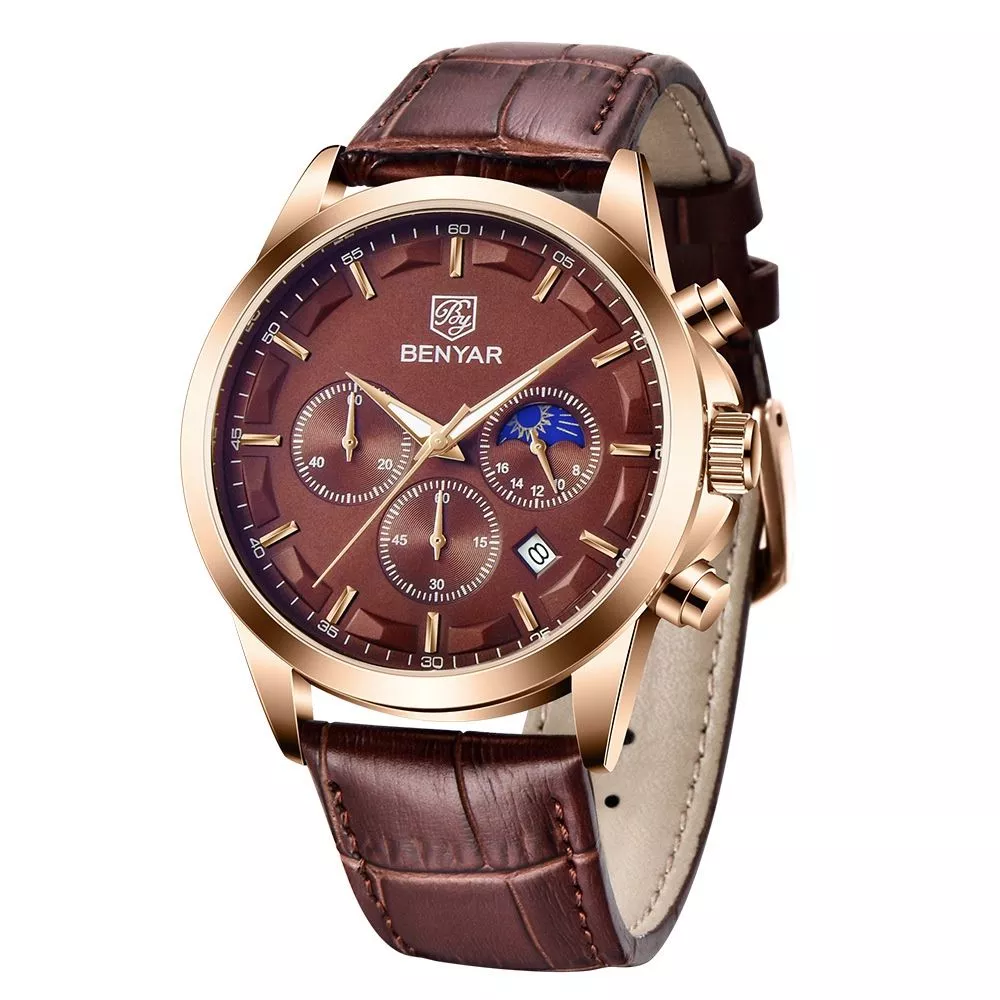 Montre Cuir Benyar Gold coffee : Montre Homme BENYAR Chronographe de Sport pour Hommes
