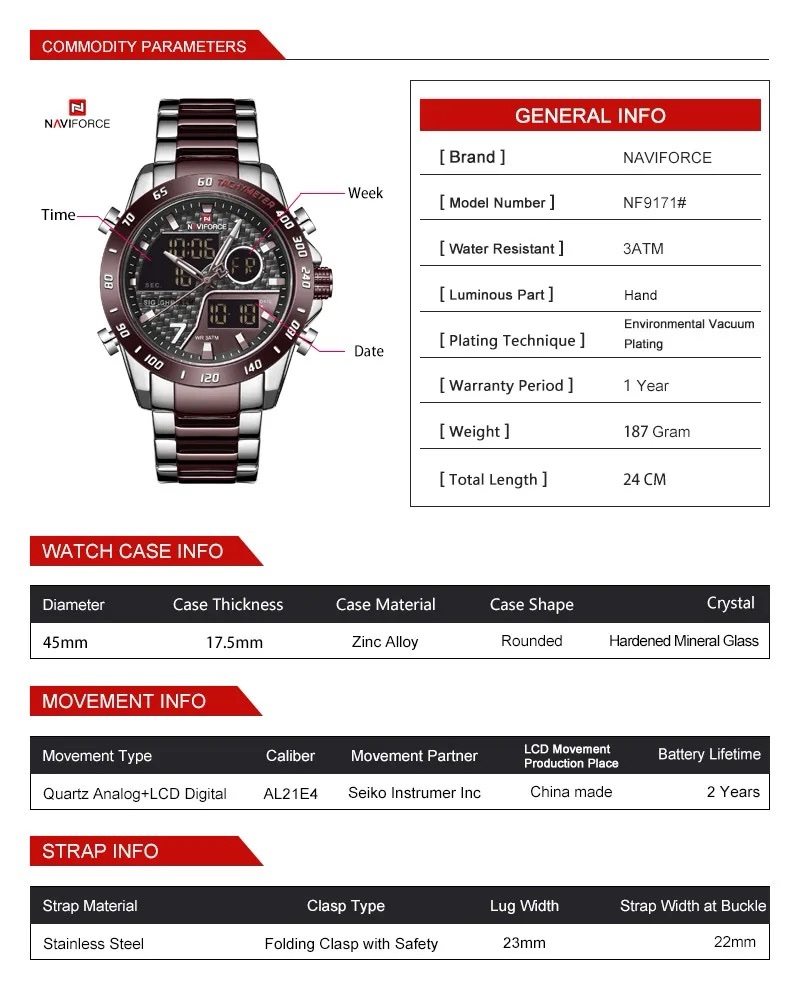 Affichage Analogique-Numérique Diamètre du boîtier: 45mm Epaisseur du boîtier: 16mm Matière du bracelet: cuir Largeur du bracelet: 22 mm Type de Mouvement: Quartz japonaise