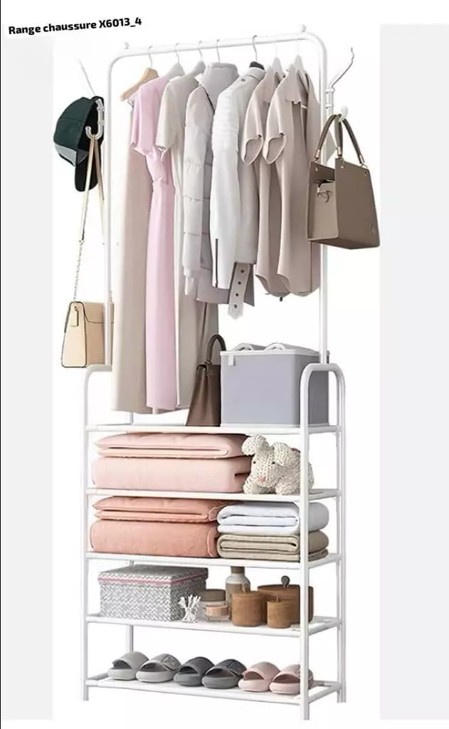 Avec ses multiples couches, cet organisateur intelligent maximise l’utilisation de l’espace, offrant un rangement amplement dimensionné pour vos chaussures, chapeaux, vêtements et accessoires. La conception ingénieuse permet de ranger vos articles de manière ordonnée, libérant ainsi de l’espace dans votre chambre, votre hall d’entrée ou tout autre endroit où vous choisissez de l’installer. Le support suspendu pour vêtements ajoute une fonctionnalité supplémentaire, permettant de garder vos vêtements bien rangés et facilement accessibles. Fabriquée avec des matériaux de qualité supérieure, cette étagère garantit une robustesse et une durabilité exceptionnelles, assurant ainsi une utilisation à long terme sans compromettre le style.