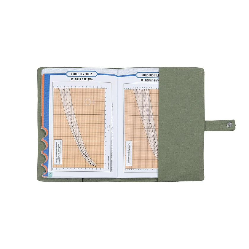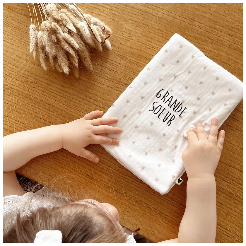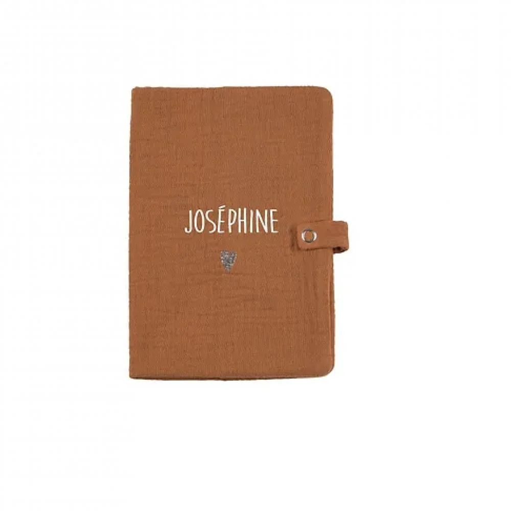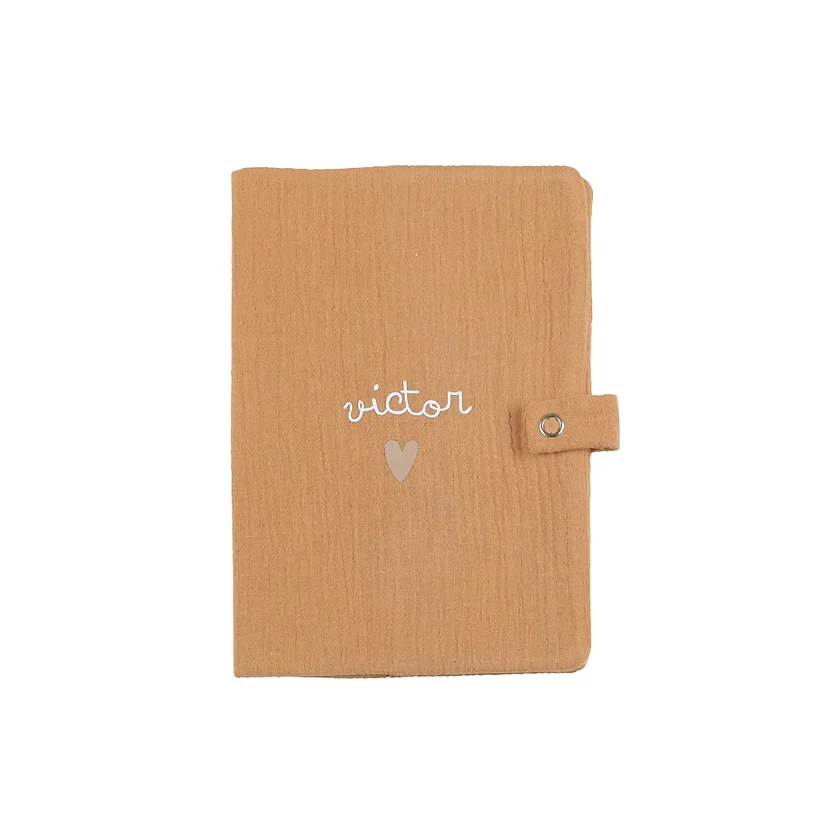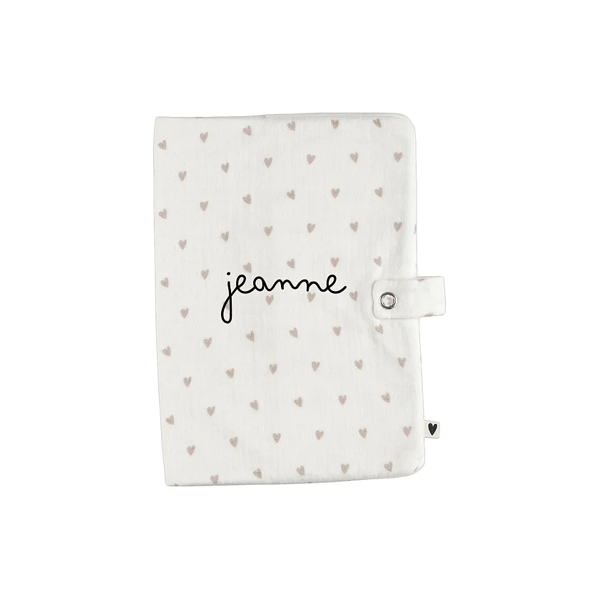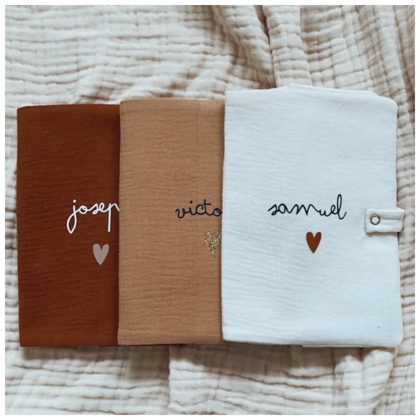Protège carnet de santé en gaze de coton Format fermé : 22x16cm Fabriqué au portugal. Ne pas laver en machine Deux typographies disponibles : – écriture 1 : typographie baton en majuscules – écriture 2 : typographie manuscrite sans majuscules possible Coloris du coeur au choix.