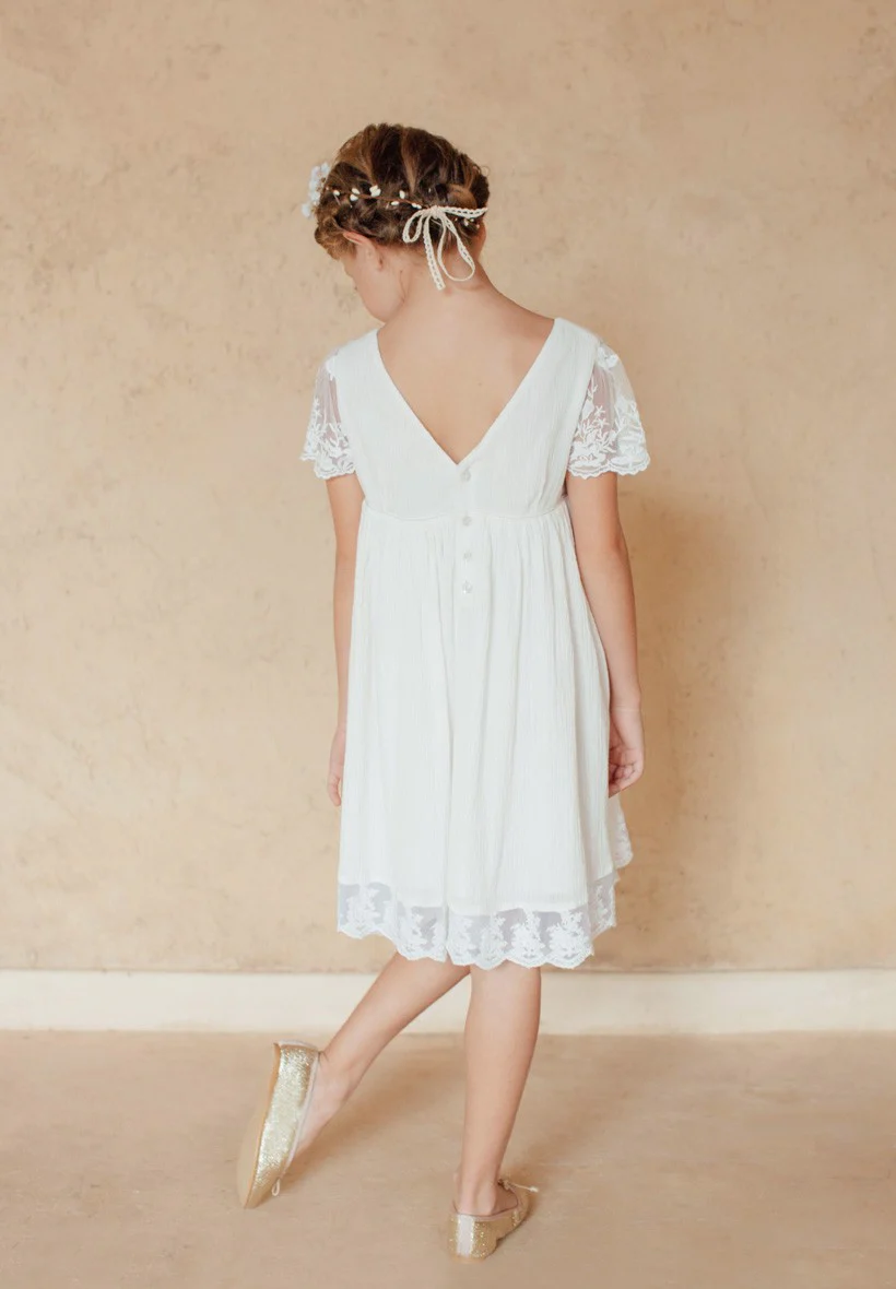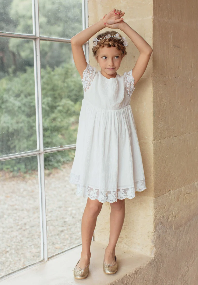 Entièrement doublée de voile de coton, sa forme fluide et légèrement ample, sa matière en coton agréable et respirante plairont à toutes les petites filles ou adolescentes invitées à un mariage ou une grande fête. Originale et très stylée, elle possède une encolure dos en V, refermée par une boutonnière.