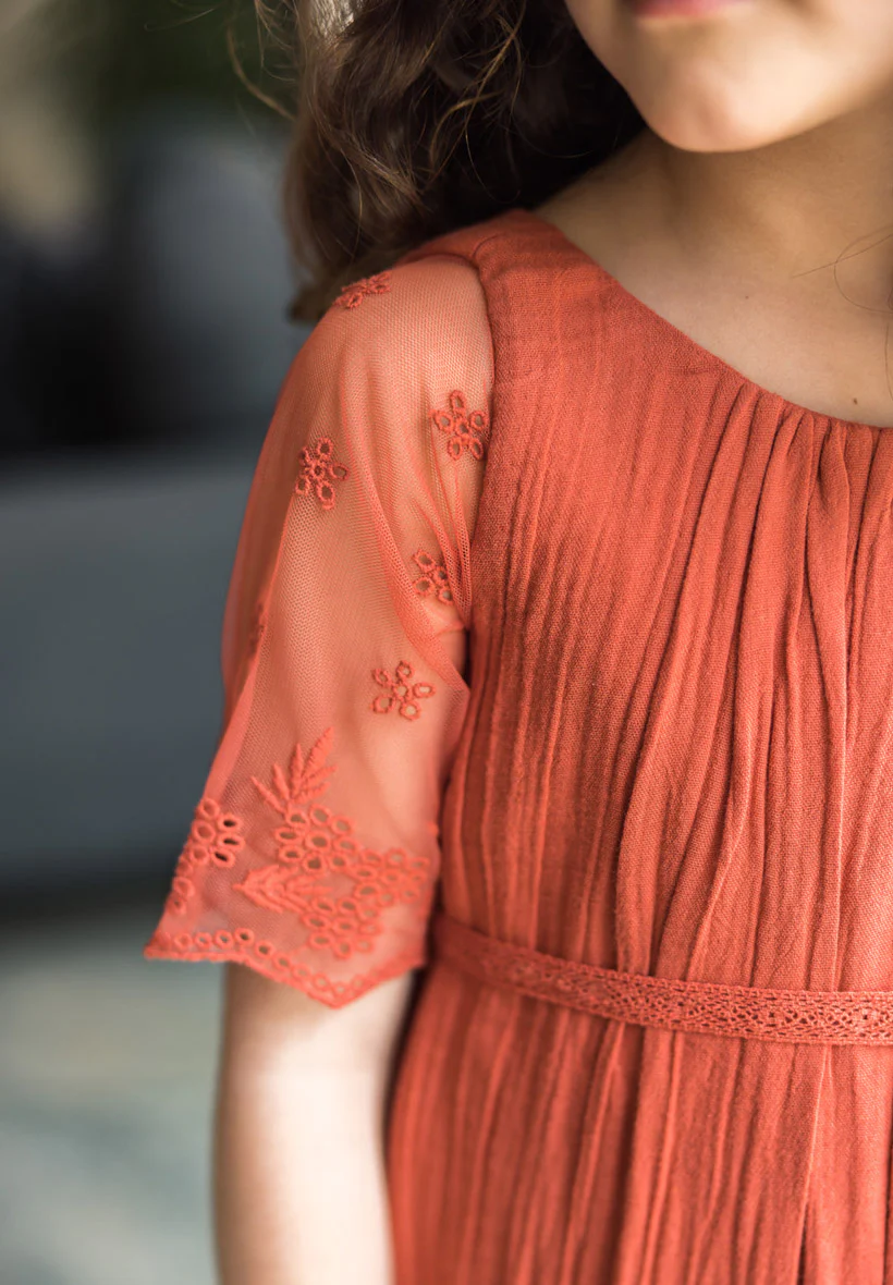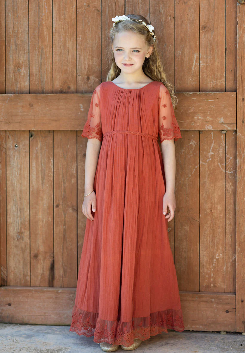 Notre emblématique robe de cérémonie bohème pour fillettes Thelma se décline désormais dans le coloris terracotta,
