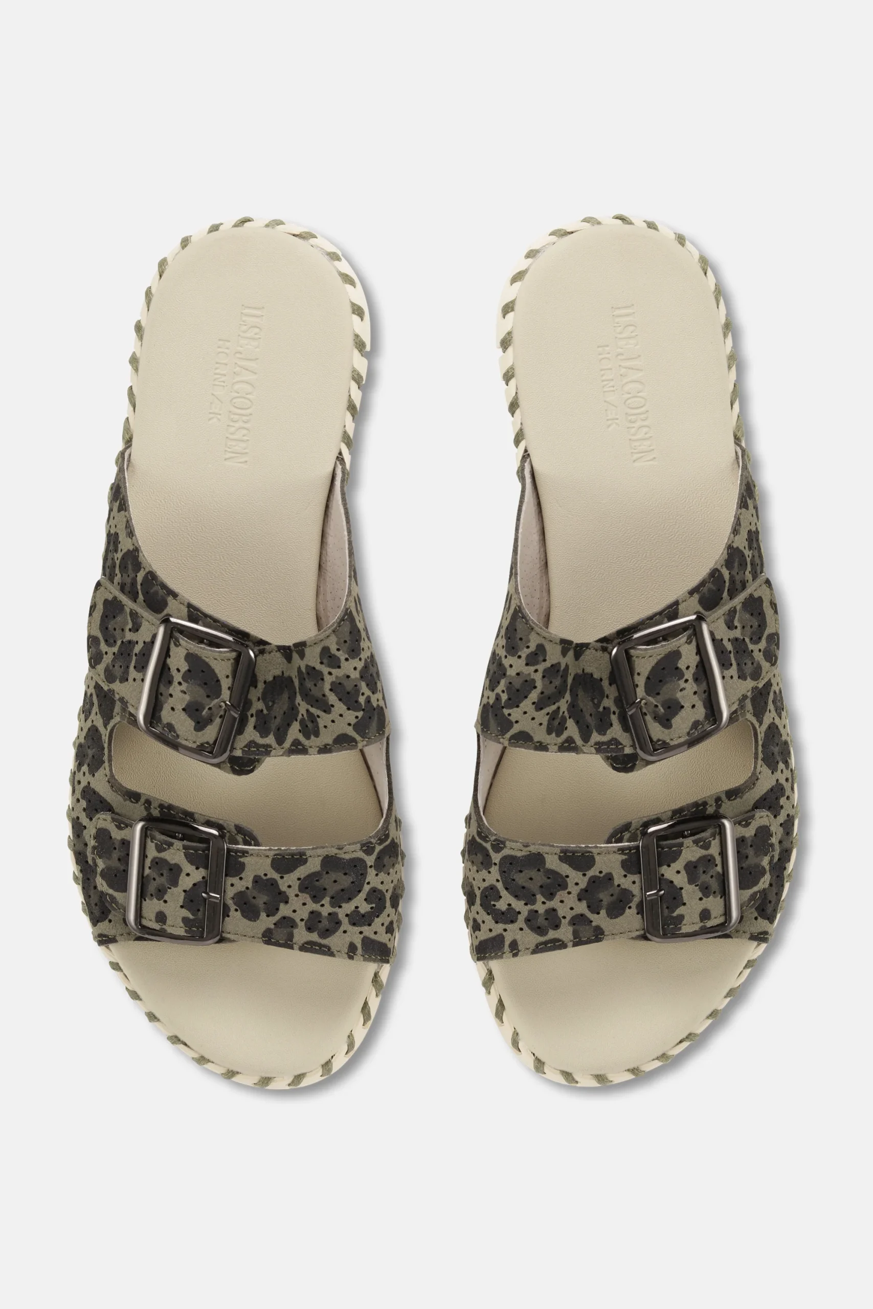 Sandale à enfiler tulipe par Ilse Jacobsen. La tige est en microfibre imprimée avec des trous et des boucles découpés au laser. La semelle est composée à 75 % de caoutchouc naturel et à 25 % de caoutchouc recyclé. Le tissu supérieur est en microfibre recyclée : 60 % nylon et 40 % PU