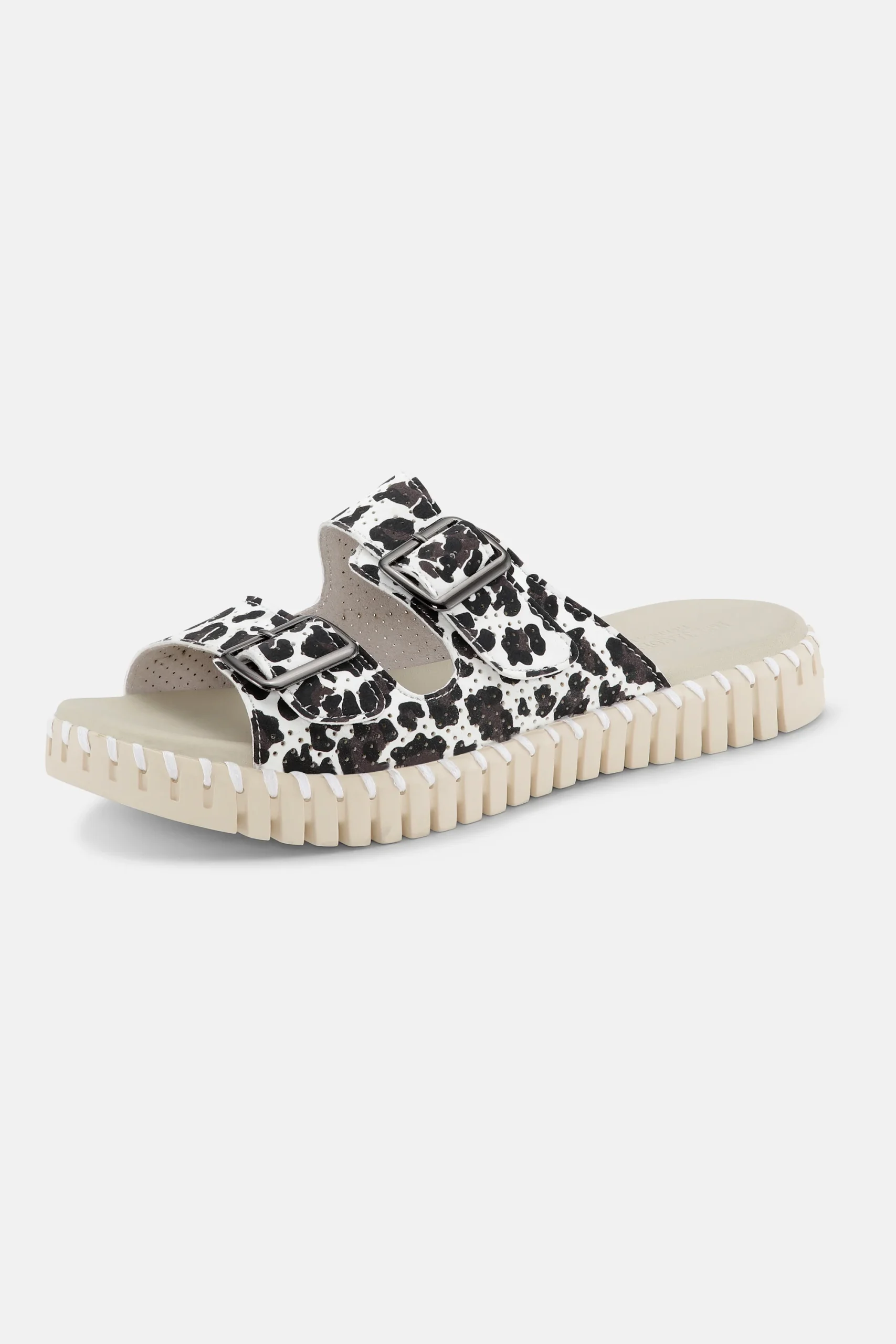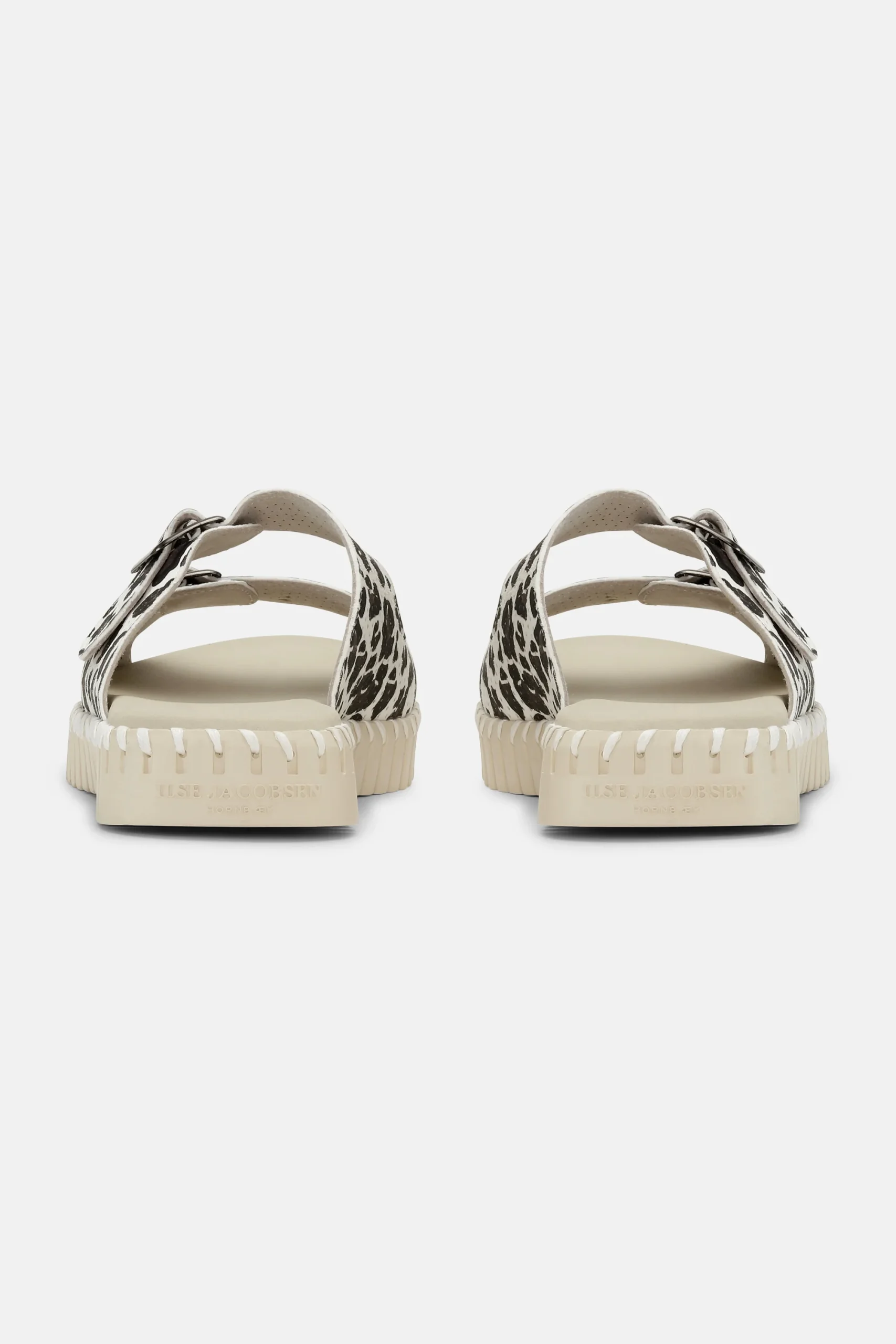 Sandale à enfiler tulipe par Ilse Jacobsen. La tige est en microfibre imprimée avec des trous et des boucles découpés au laser. La semelle est composée à 75 % de caoutchouc naturel et à 25 % de caoutchouc recyclé. Le tissu supérieur est en microfibre recyclée : 60 % nylon et 40 % PU
