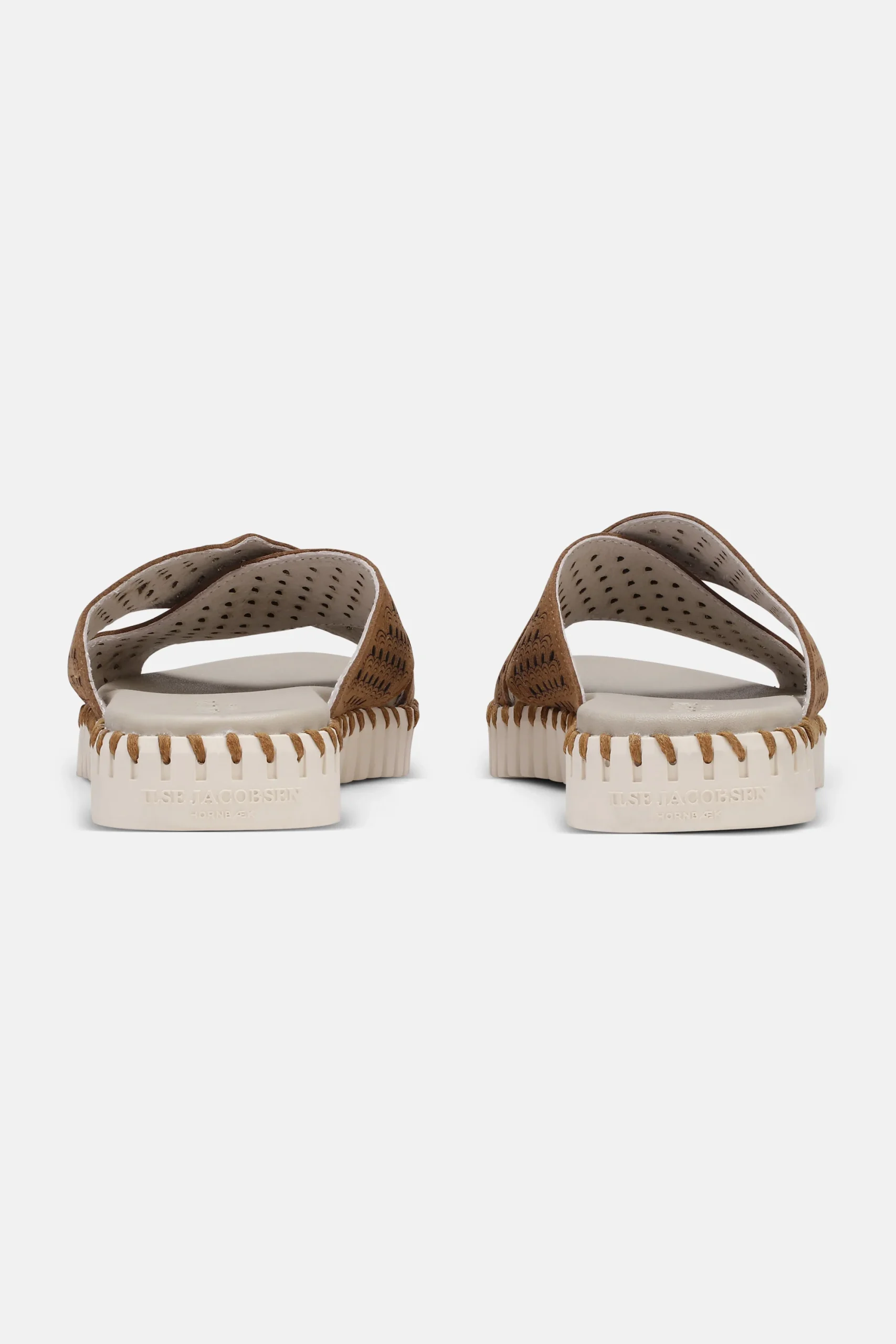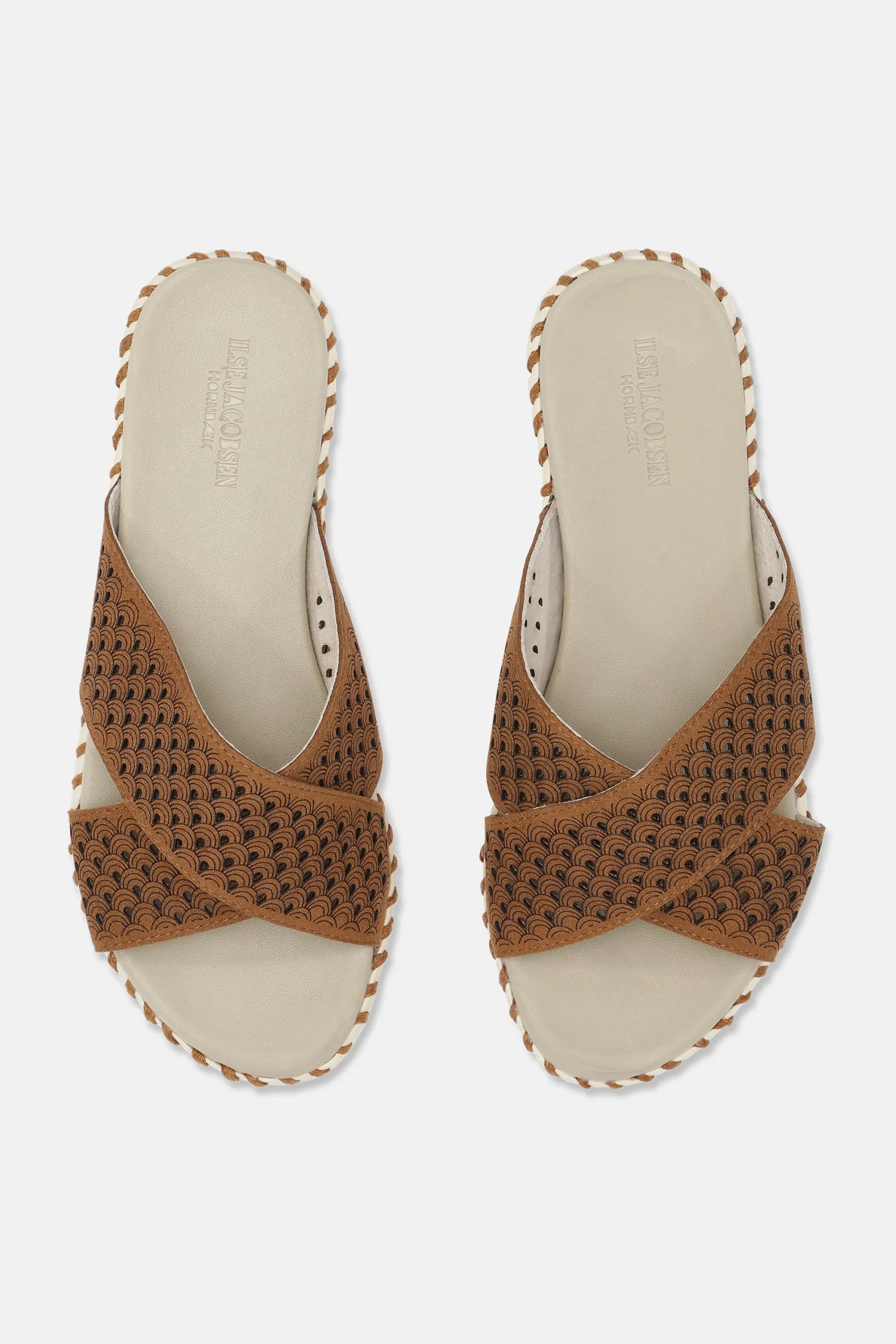 Sandale Tulip à enfiler par Ilse Jacobsen. La tige est en microfibre recyclée avec un motif décoratif découpé au laser. Disponible en plusieurs coloris, avec des coutures recyclées assorties. Sa semelle confortable et flexible est composée à 75 % de caoutchouc naturel et à 25 % de caoutchouc recyclé. Tige : microfibre recyclée – 60 % nylon, 40 % PU.