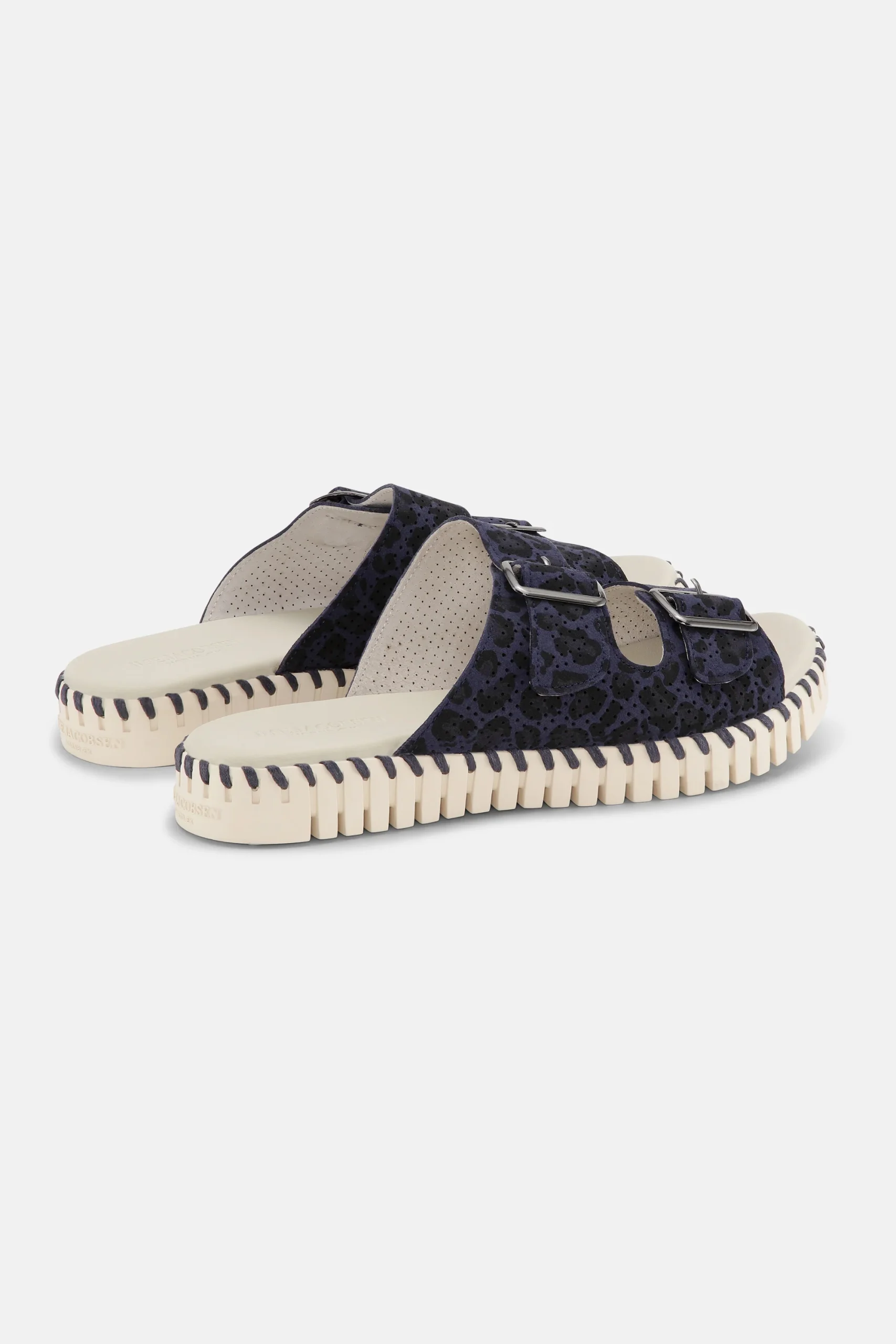 Sandale à enfiler tulipe par Ilse Jacobsen. La tige est en microfibre imprimée avec des trous et des boucles découpés au laser. La semelle est composée à 75 % de caoutchouc naturel et à 25 % de caoutchouc recyclé. Le tissu supérieur est en microfibre recyclée : 60 % nylon et 40 % PU
