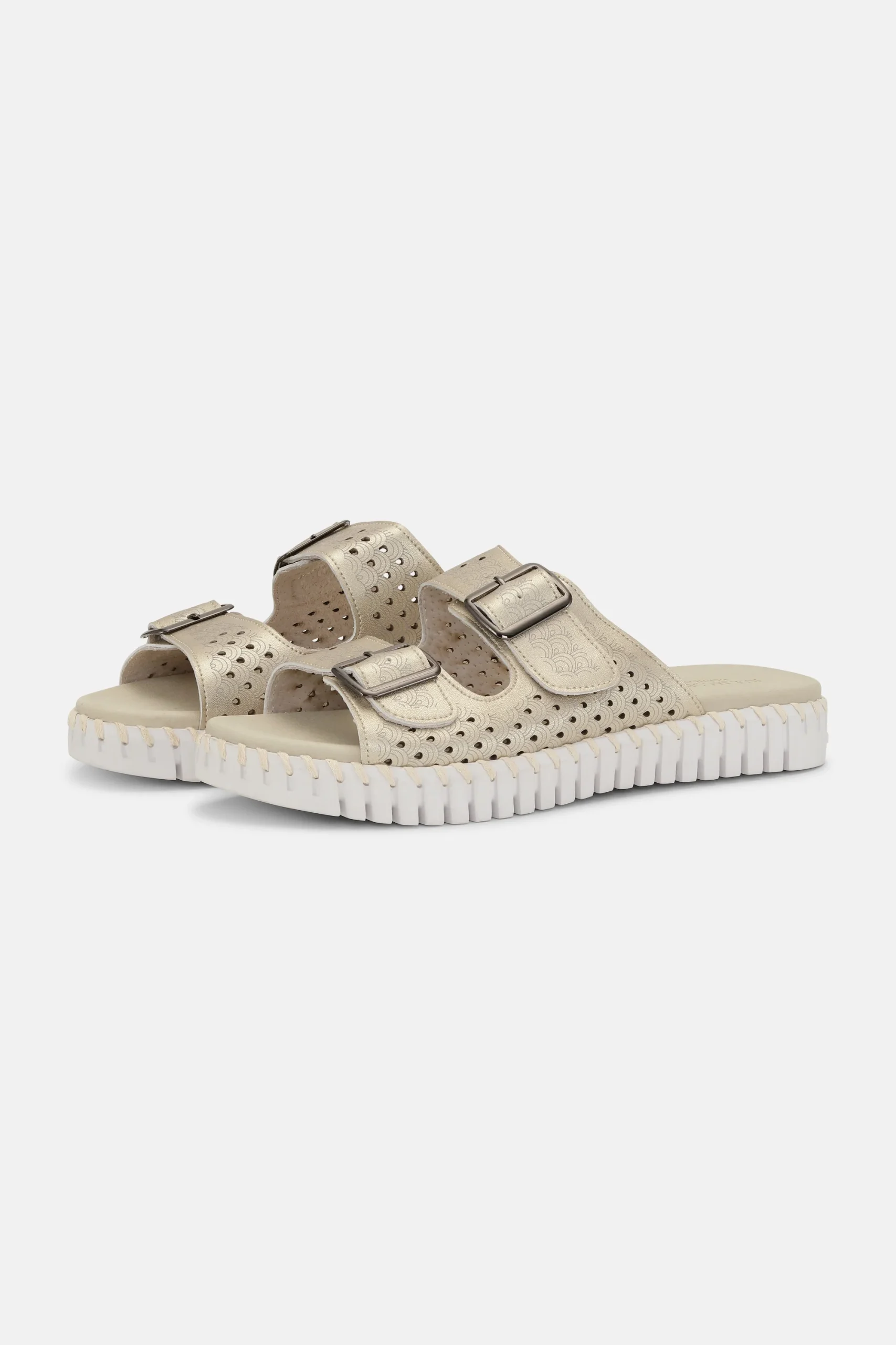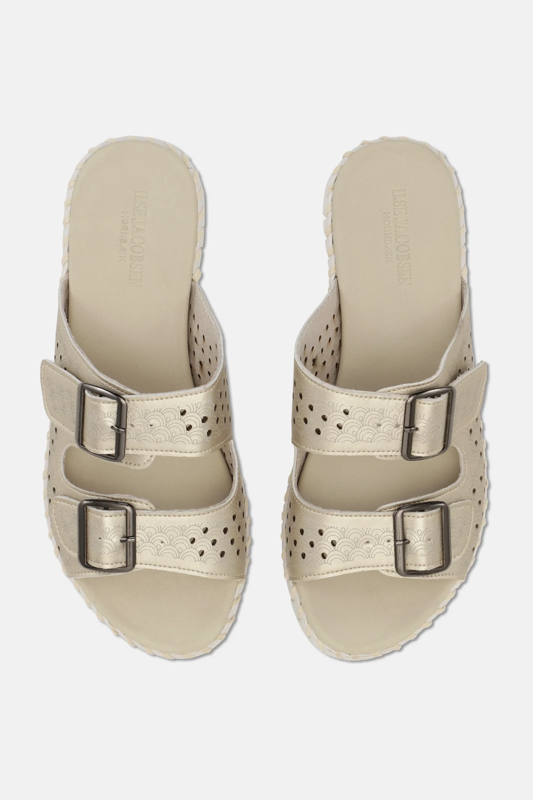 Sandale légère signée Ilse Jacobsen. La tige est en microfibre métallisée ornée d’un motif découpé au laser. La semelle extérieure est composée à 75 % de caoutchouc naturel et à 25 % de caoutchouc recyclé.