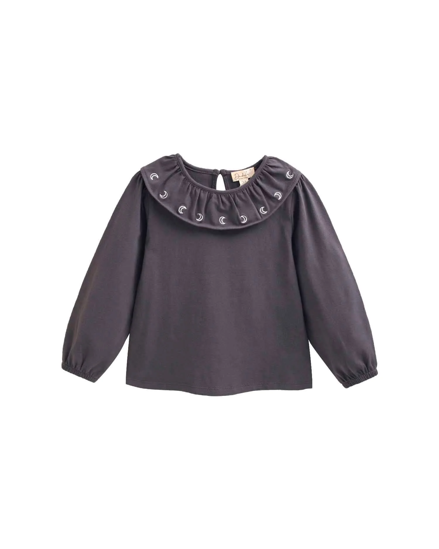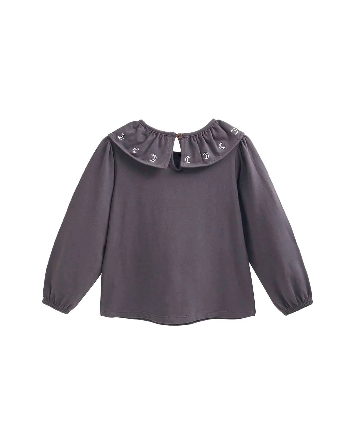 T-shirt gris foncé pour fille avec col volanté et broderie