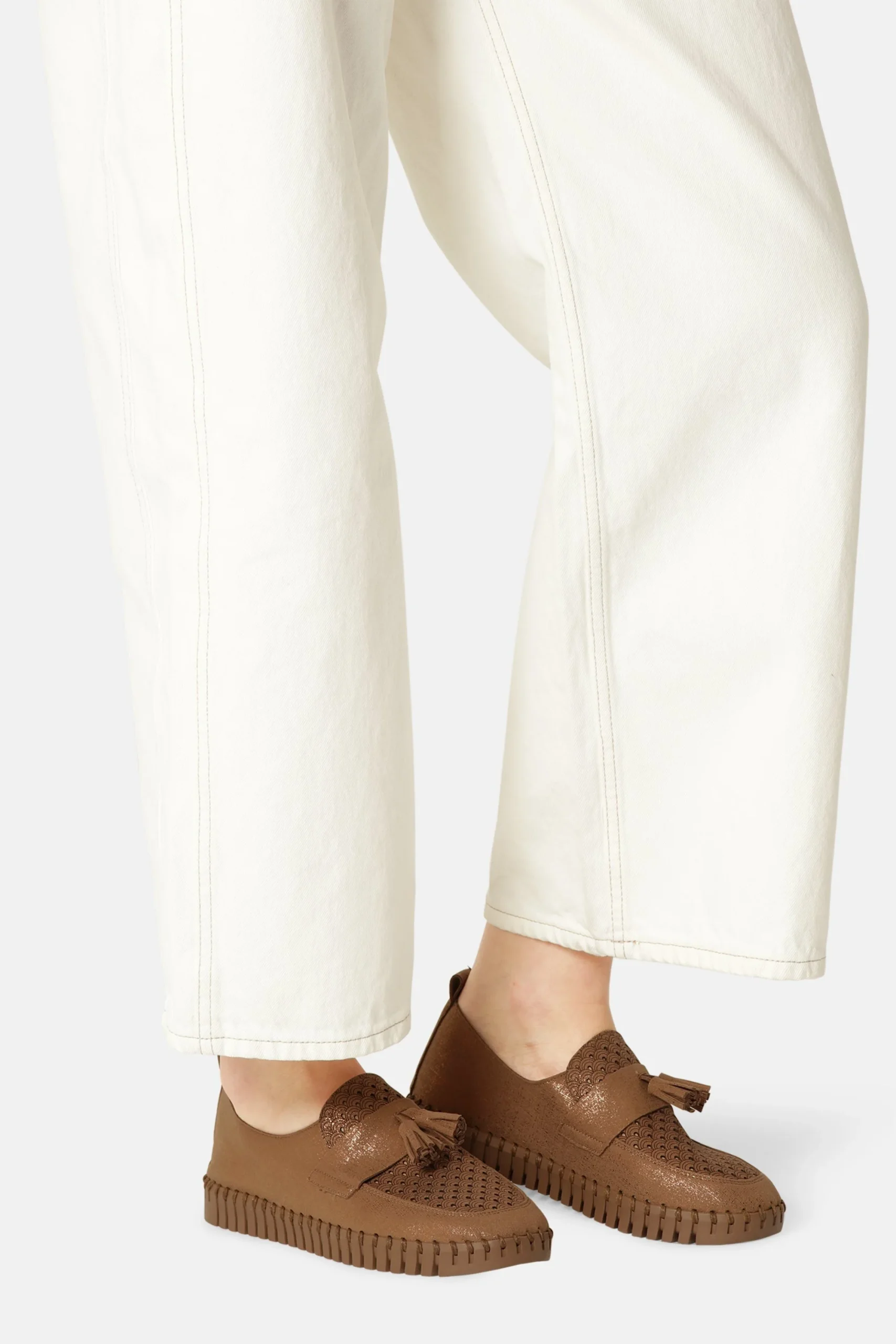 Tulip shoe in a loafer model, with a strap and tassels at the front. Featuring an upper crafted from recycled microfiber with glitter surface, and attached to our iconic Tulip outsole with matched colored recycled thread. The soft insole has padding and support, ensuring great comfort.