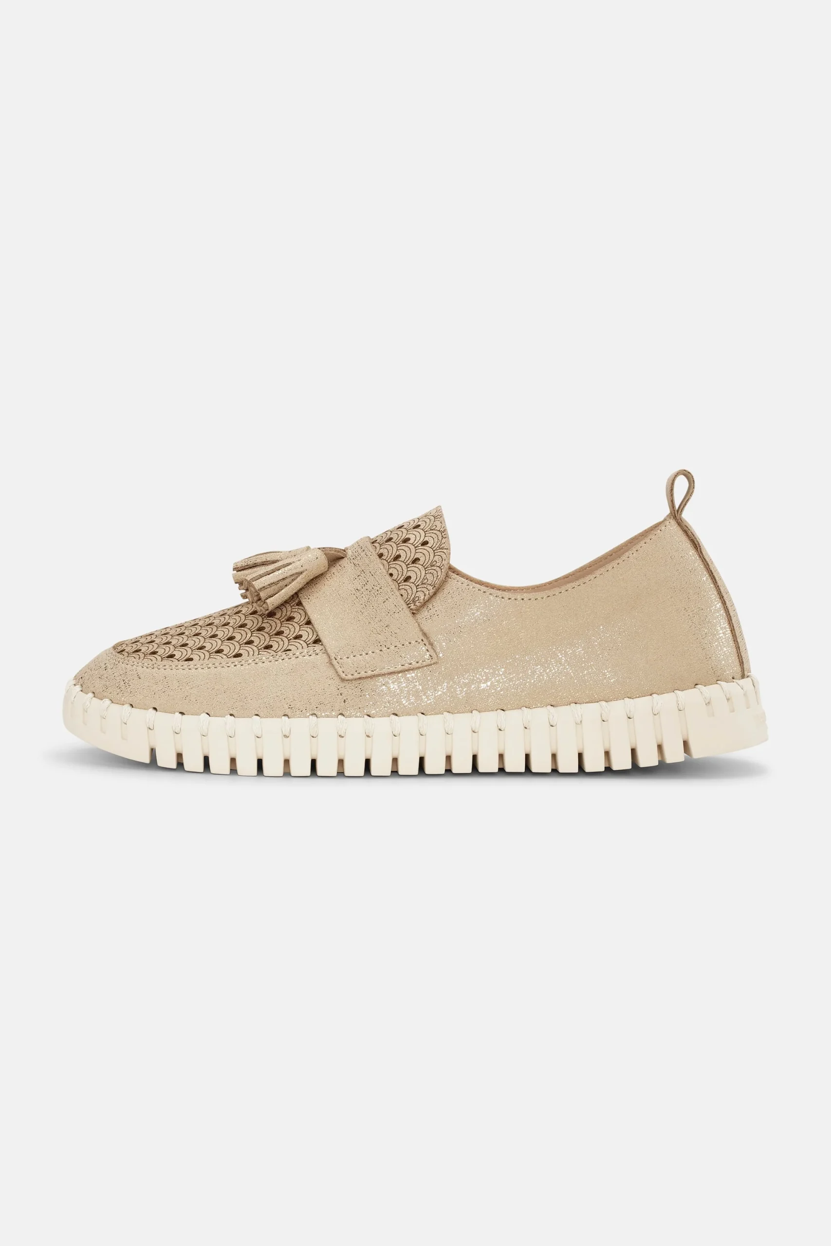 Tulip shoe in a loafer model, with a strap and tassels at the front. Featuring an upper crafted from recycled microfiber with glitter surface, and attached to our iconic Tulip outsole with matched colored recycled thread. The soft insole has padding and support, ensuring great comfort.