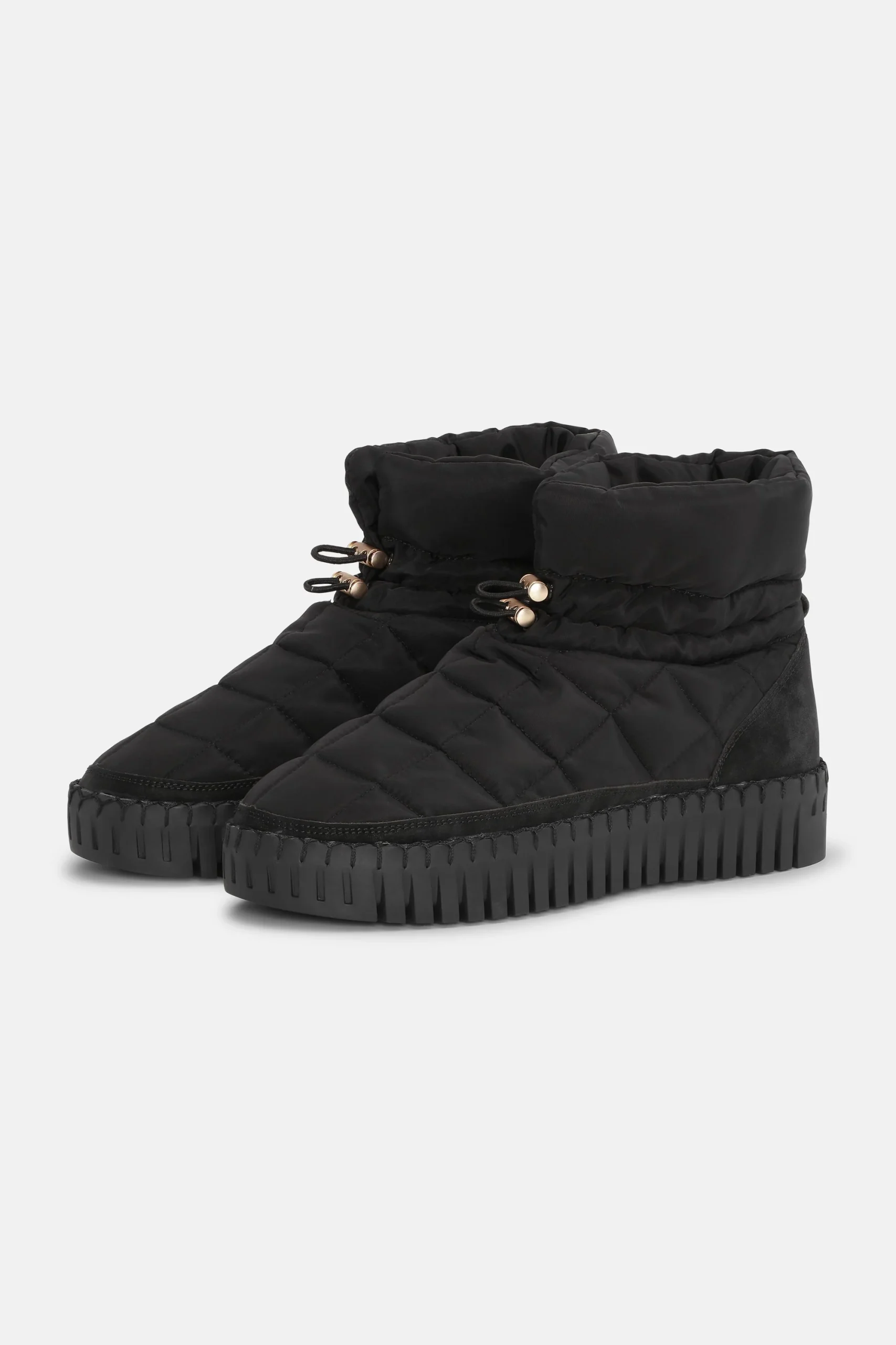 Tulip winter boot with a quilted pattern and a water-repellent surface. Drawstrings at front for adjustments. Warm artificial down padding and microfiber lining for colder days. Resting on a waterproof outsole with match color recycled thread. The insole has padding and support to ensure great comfort.