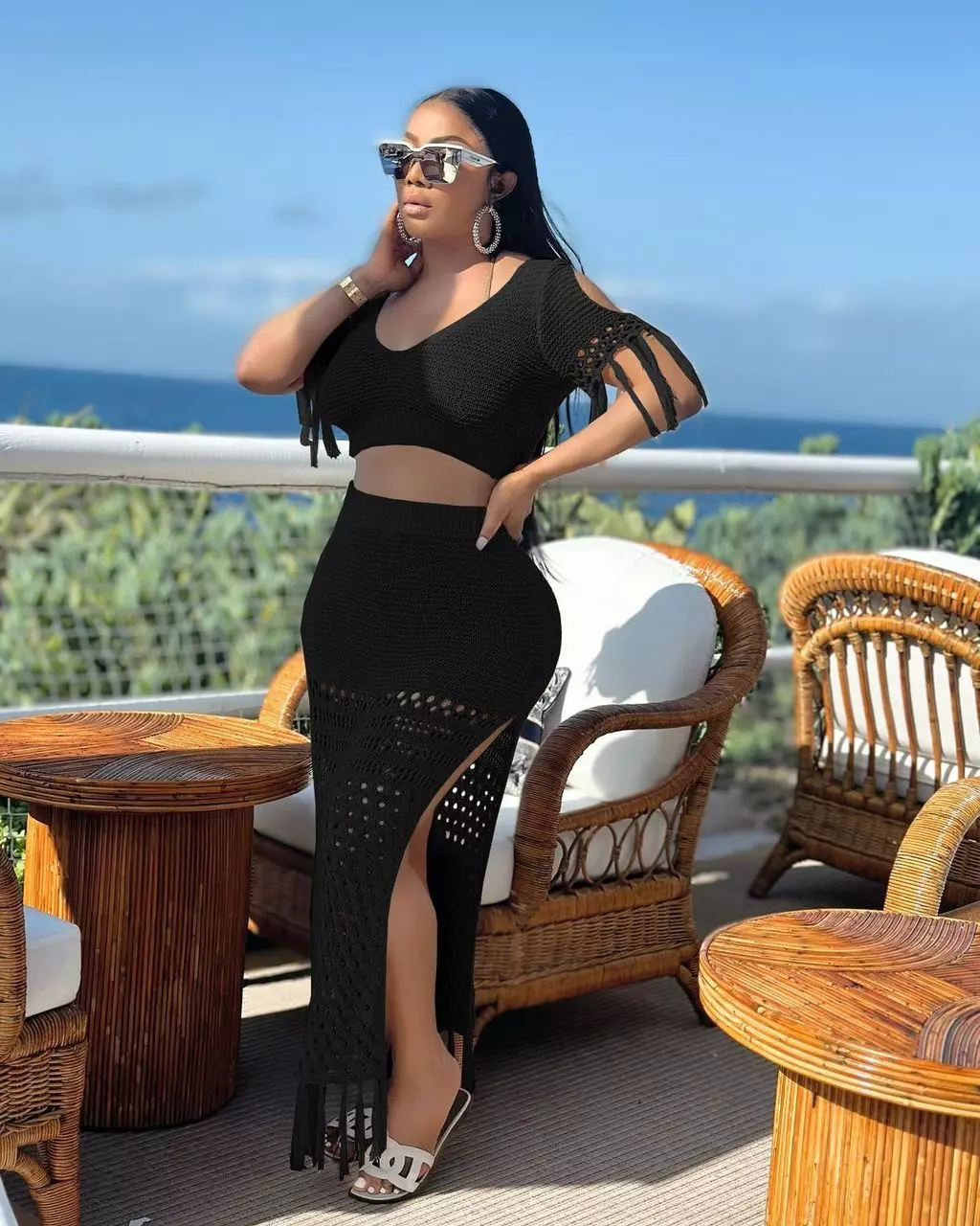 Womens Sexy 2 Pieces Solid Color Knitted Crochet Hollow Tassel Split Dress Set Beach Dress